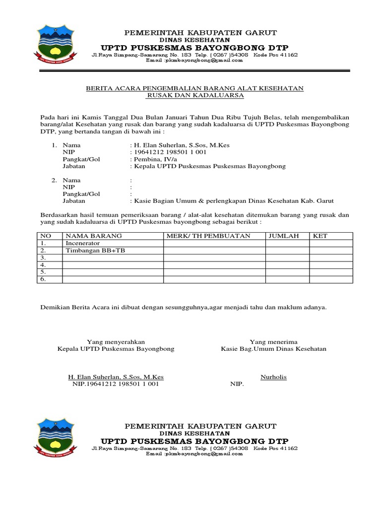1932016 BERITA ACARA PENGEMBALIAN BARANG LAB RUSAK DAN KADALUARSA. Pada hari ini Selasa Tanggal Dua Puluh Enam Bulan Mei Tahun Dua Ribu Lima Belas telah mengembalikan barangalat laboratorium yang rusak dan barang yang sudah kadaluarsa di UPTD Puskesmas DTP PONED Klari yang bertanda tangan di bawah ini. Baik itu menyangkut rapat kehilangan kerusakan serah terima barang peristiwa penyelesaian pekerjaan perubahan status dan masih banyak lagi lainnya.
