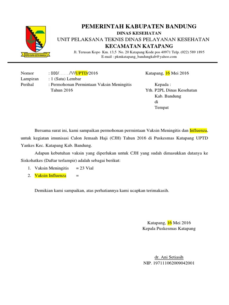 Kepala Dinas Perhubungan KabupatenKota. Permohonan vaksin Sehubungan dengan keadaan vaksin di rumah sakit pada saat ini dalam keadaan kosong dan untuk kelancaran program imunisasi maka kami mengajukan permohonan vaksin sebagai berikut. BANJARMASINPOSTCOID JAKARTA - Surat vaksin alias sertifikasi vaksinasi covid-19 saat ini sedang jadi buah bibir.